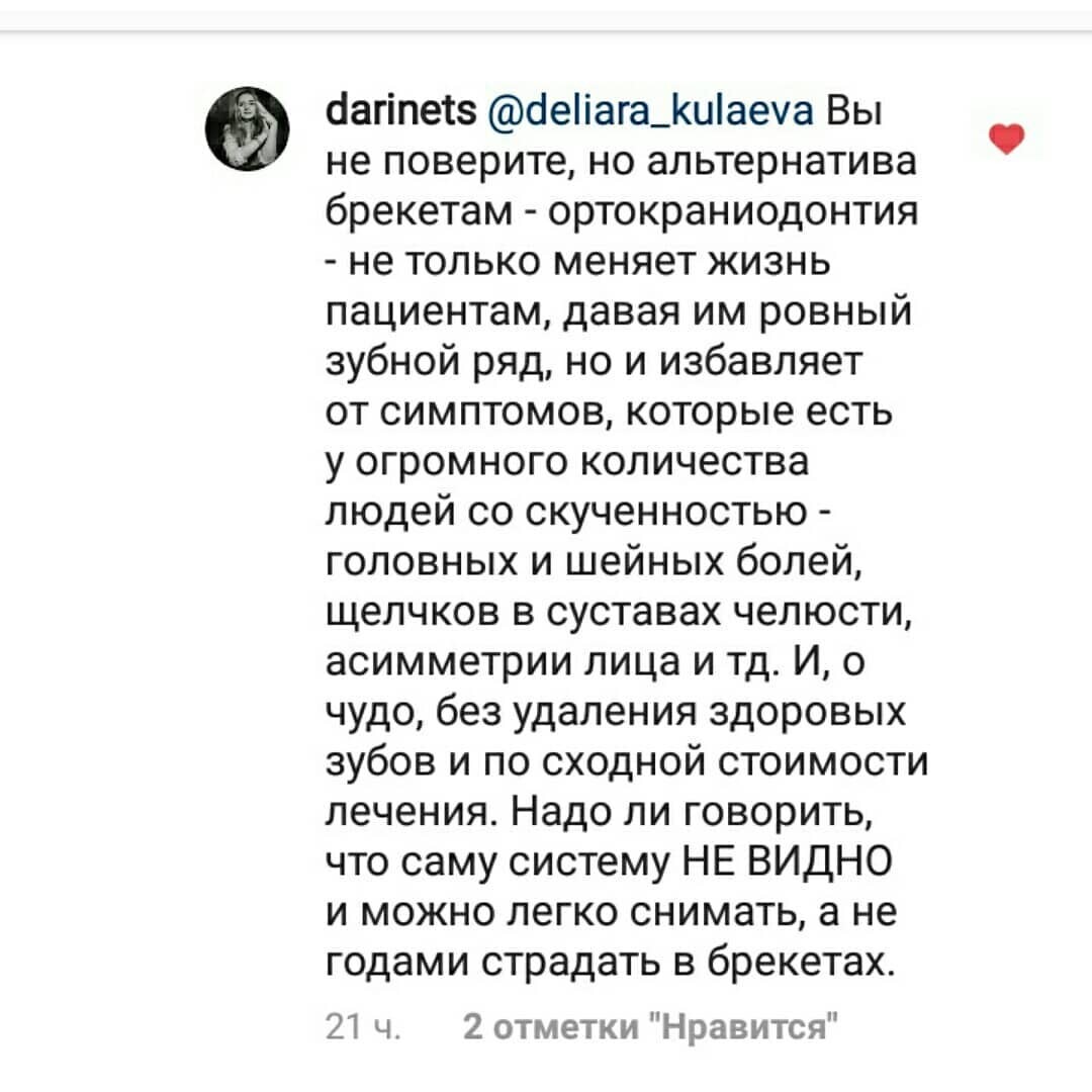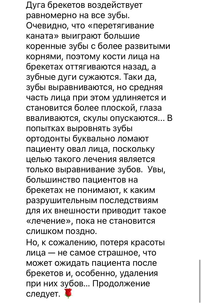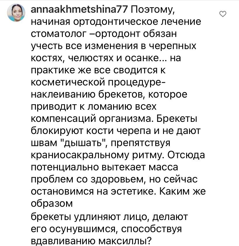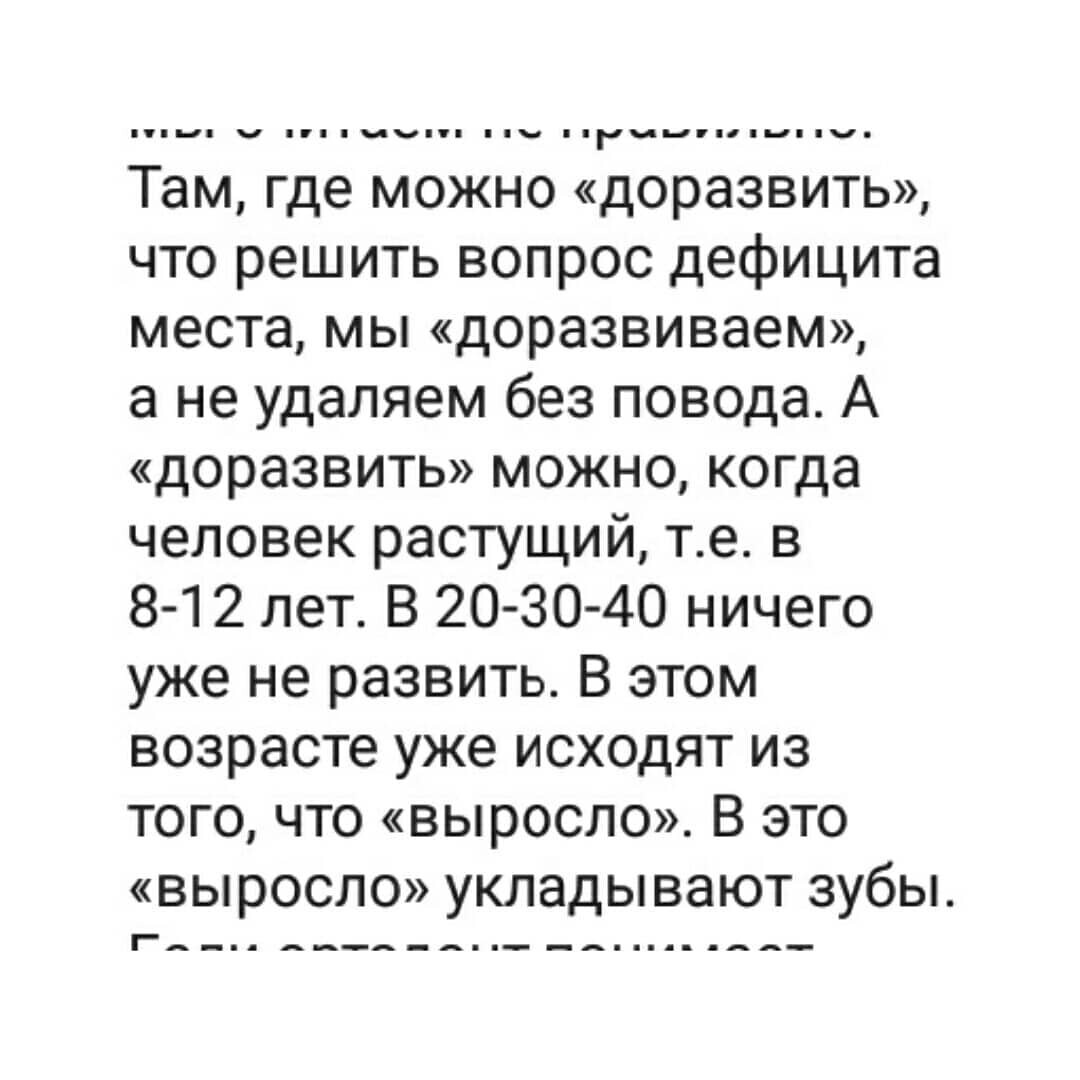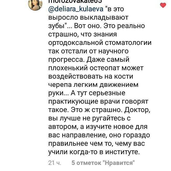 Я даже не подозревала всю глубину "познаний" наших ортодонтов в духе "кости не могут двигаться" и "что выросло- то выросло, запихнем зубы в то, что есть". Про связь окклюзии и постуры не слышали, остеопатия вообще ересь). Собственно что и требовалось доказать). И таки да, если на уважаемых ортодонтов снова накатит спорить - не тратьте, пожалуйста, время, обращайтесь, например, к кандидату медицинских наук, ортодонту-стоматологу профессору Насырову, который успешно применяет метод окклюзивно-структурального баланса в своей клинике. Или к другим врачам, контакты дам, кому надо).