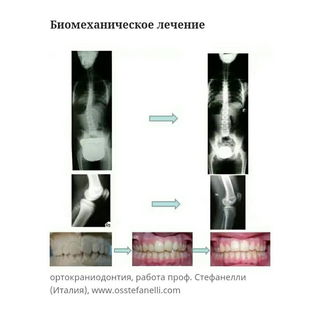 Например, с уменьшением высоты зубов с левой стороны череп теряет свою поддержку на этой стороне. Скелет, уже более не являющийся совершенным, начинает изменяться в сторону асимметрии и сколиоза...