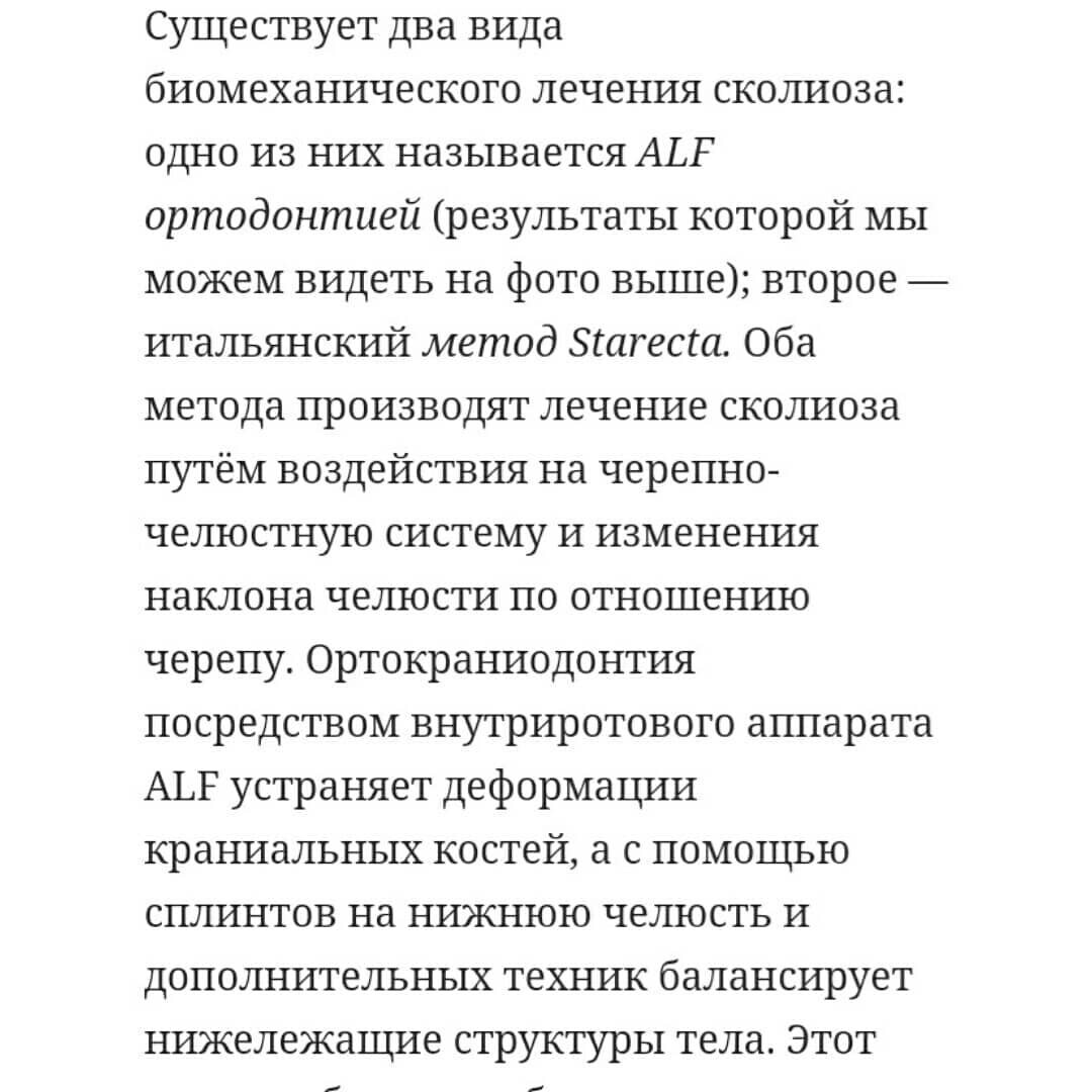 Многочисленные исследования, которых в медицинской литературе уже более ста*, определили, что сколиоз развивается в результате неравномерного давления на позвоночник веса черепа, который, не находя надлежащей поддержки в зубных дугах, проседает, опускается и скручивается, оказывая деформирующее воздействие и на позвоночник.
