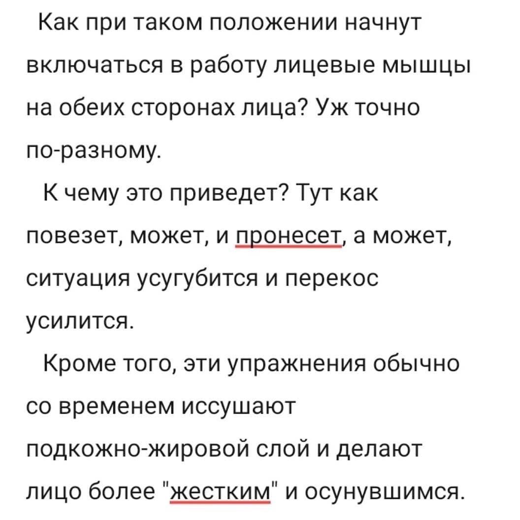 Я уже даже не говорю, что слабые мышцы слабыми и останутся, а сильные всегда возьмут на себя всю нагрузку, поэтому "подкачать" отдельные пучки мимических мышц весьма проблематично, не заспазмировав и без того сильные напряженные соседние мышцы, поскольку все они тесно взаимосвязаны.
