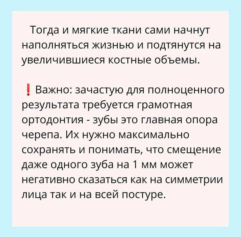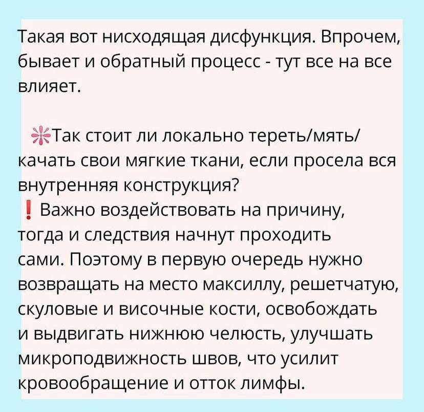 ❗️лицо вытягивается, сужается, виски и глаза проваливаются, щеки впадают (либо появляются брыли и "птоз", ведь лишним тканям надо куда-то деваться), удлиняется расстояние от носа до губы, появляются отеки (смещение костей нарушает нормальный лимфодренаж), нижняя челюсть поджимается вглубь черепа, а, значит, появляется второй подбородок, угол молодости исчезает, овал плывет, а затем, как следствие, меняется наклон головы, ухудшается статика шеи и далее всего позвоночника...