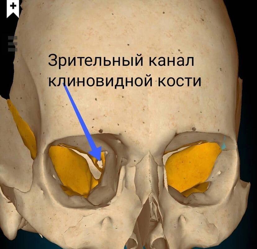 Наш глаз располагается в пещерке (глазнице), стенки которой образованы сразу несколькими костями черепа, см. фото. И самое важное, что основные пути иннервации и кровоснабжения глаза - зрительный нерв и глазная артерия - проходят как раз через через отверстие клиновидной кости (зрительный канал). Кроме того, через глазничную щель клиновидной кости в глазницу проходит ещё куча нервов (глазодвигательный, блоковый, отводящий и глазной)