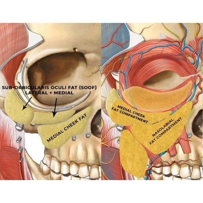 При западении максилл и смещении костей лицевого черепа происходит потеря именно костного объема в области медиального скулового жира (см в карусели), что приводят к опусканию кожи вниз и вперед и сползанию Жировой подушки. Провалились кости - все вышележащие структуры начали сползать
