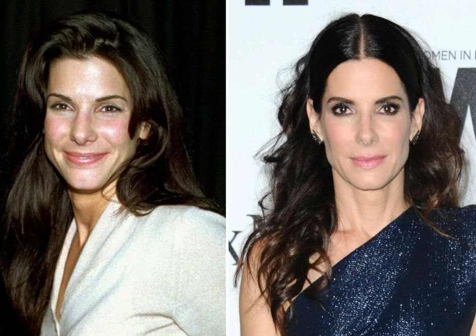 А вот у Сандры Буллок ямочка совсем без изменений, что как раз косвенно говорит о том, что череп у нее очень сохранный.