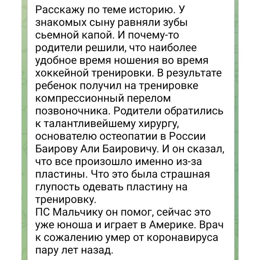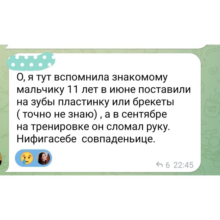 Смысл был в следующем: одна мама рассказала, что после установки брекетов ребенок на танцах сломал руку, и мама совершенно правильно предположила, что тут возможна связь.