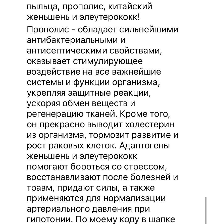 не рекомендуется принимать перед сном), улучшает память, работу сердца, процессы кроветворения и кровообращения спинного и головного мозга, регулирует обмен веществ, улучшает работу органов пищеварения, воздействуя на ферментный состав желудочного сока, выделение желчи и перистальтику кишечника, препятствует развитию атеросклероза, снижая уровень плохого холестерина и сахара в крови, нормализует артериальное давление, помогает восстановить работу надпочечников (нормализация гормонального фона).