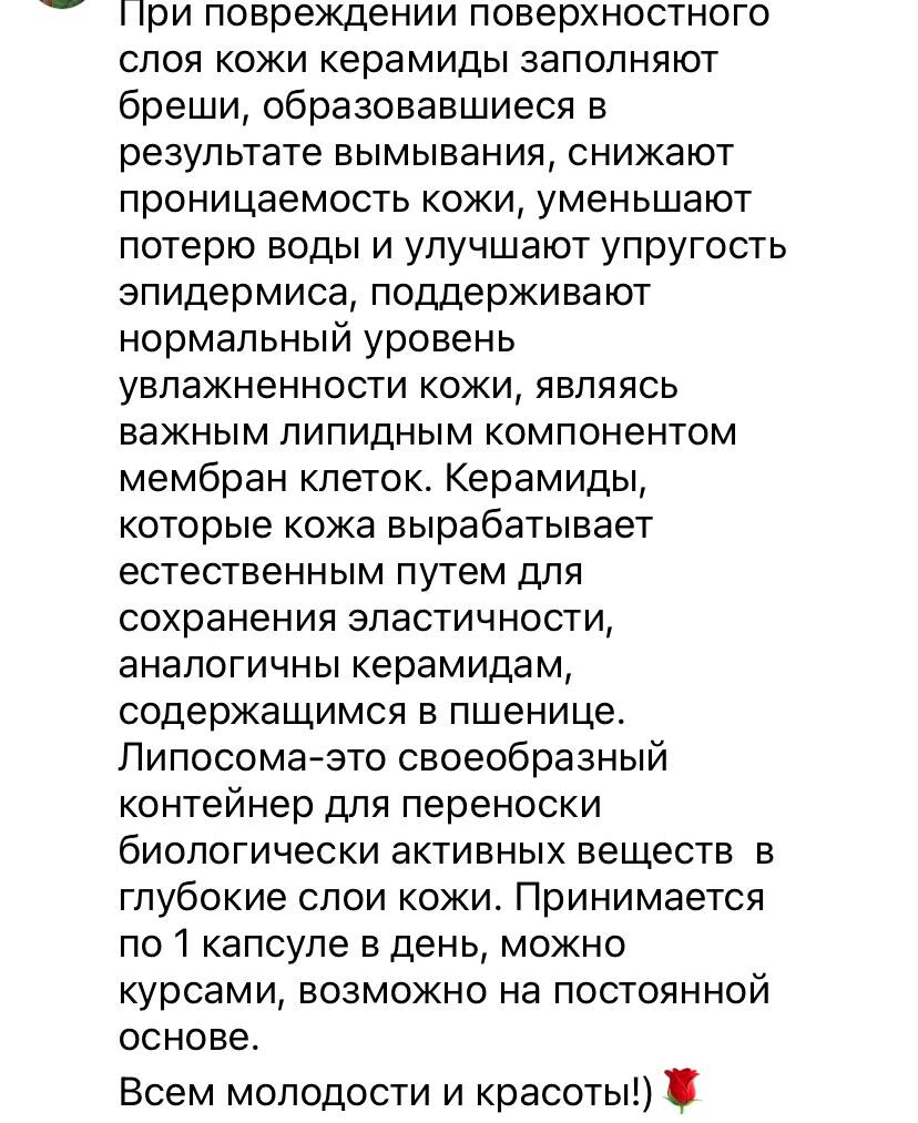 🔸Восстанавливающие кожу фитокерамиды с липосомами из пшеницы. Обеспечивает питание и увлажненность зрелой кожи. Керамиды - это вещества, которые совместно с холестерином и жирными кислотами образуют липидный барьерный слой кожи. Продолжение👇👇👇