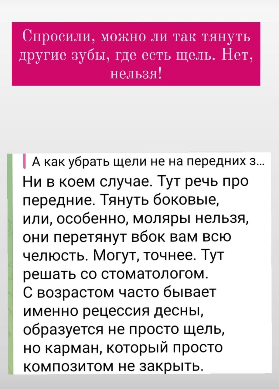 В общем, вот такие простые лайфхаки могут сэкономить вам сотни тысяч денег на брекеты. А если останутся щели по бокам, например, их можно просто достроить композитом, как я сделала в свое время после того, как мне зачем-то растащили ровные зубы ортодонтией. При этом расширили не саму дугу (зубной ряд шире не стал, а просто растащили зачем-то на передних).