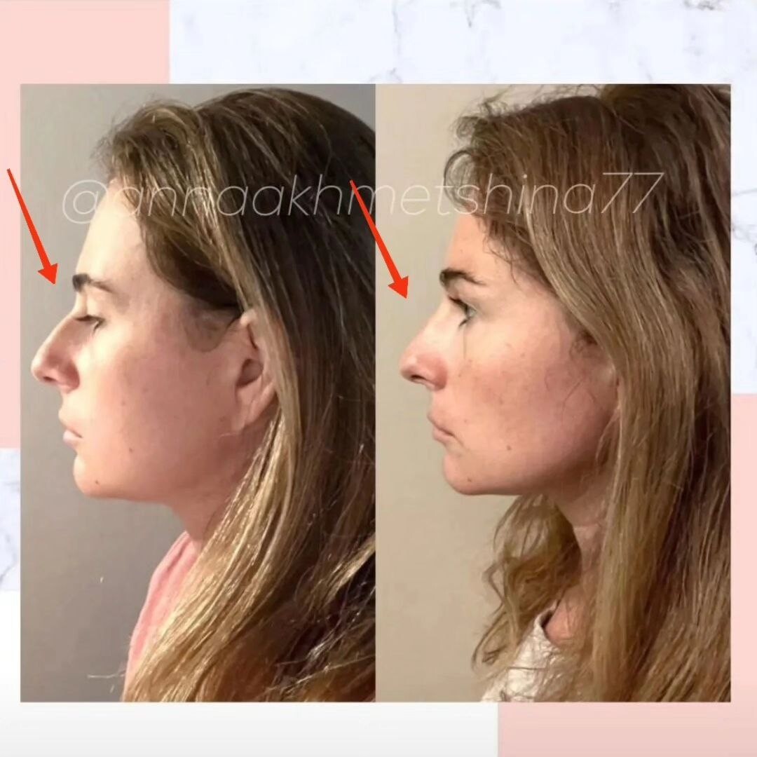 Даже если горбинки нет - кончик носа обычно у всех приподнимается, становится более округлым (с опущением максилл он клюет вниз, в нем