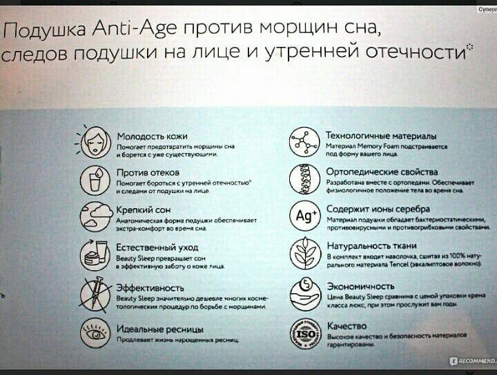 Подушка заявлена, как средство от помятого лица, имеет выемки по бокам для сна на боку, плюс у нее ортопедическая форма и изготовлена она из материала, который плавно подстраивается под форму головы и шеи, кроме того обладает гипоалергенными, антибактериальными и термоизолирующими свойствами.