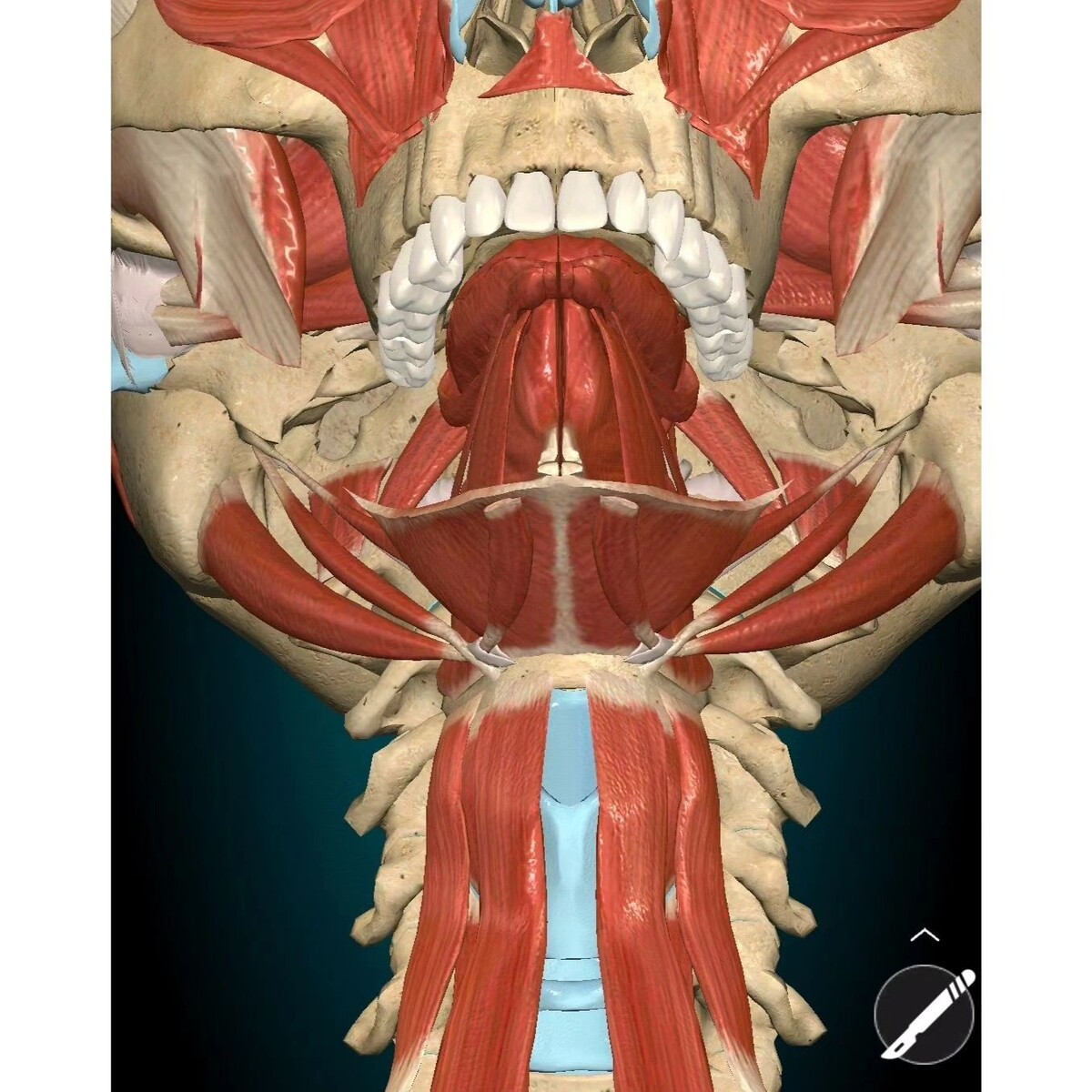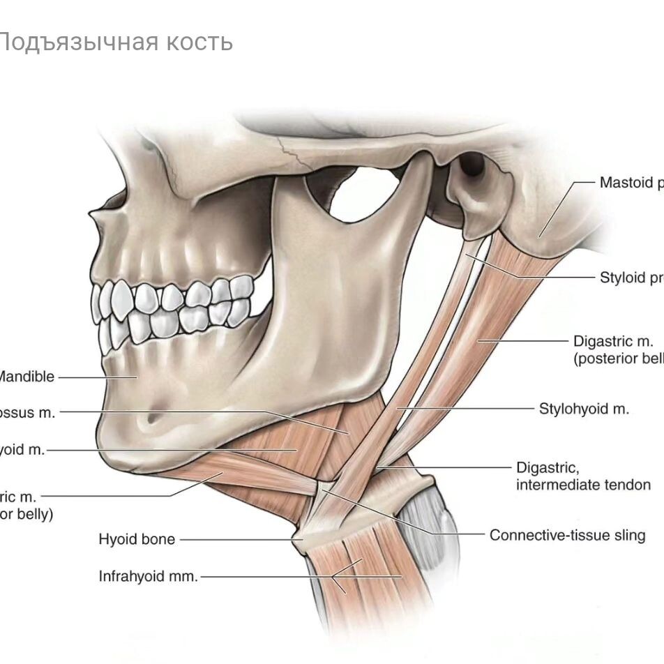 Соответственно, подъязычная кость не сама по себе висит в вакууме и внезапно уехала вниз/вглубь/набекрень, ее положение определяется общим тонусом сопричастной мускулатуры в целом и положением нижней челюсти