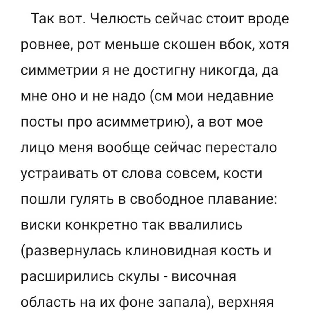 Надо понимать, что у меня случай непростой: врождённая асимметрия черепа (привет роддомам), тело нижней челюсти разной длины с двух сторон, сильный сколиоз с детства (никак не влияет на осанку, но s образное искривление), грыжа, протрузии и врожденное сращение двух позвонков в шейном отделе, поэтому по здоровью пока никакого улучшения я не ощущаю.