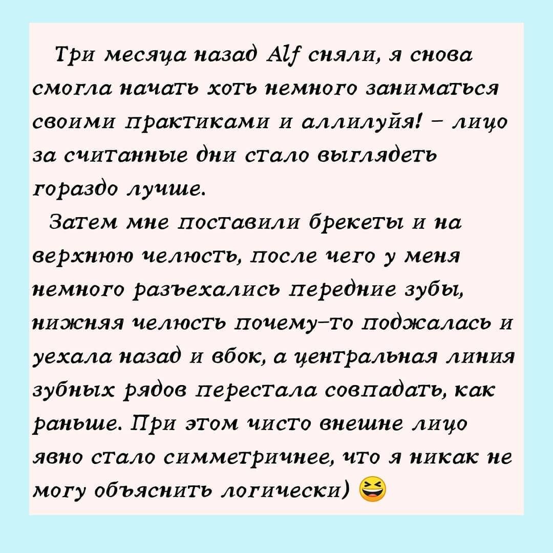 Параллельно я носила брекеты на нч, ими мы поднимаем высоту моляров, а также накладки там, где ниже скула и глаз.