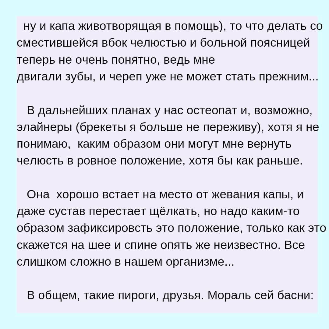 По промежуточному итогу в настоящий момент имею: аццкие боли в шее и пояснице, так, что ходить больно, разъехались передние верхние зубы, ухудшилась эстетика лица, нижнюю челюсть увело вбок, набрана тонна веса (спорт бросила, слишком больно, плюс заедаю психотравму), упало зрение, причем одним глазом не вижу вблизи, а другим вдали, ну и состояние души "прощай молодость". Впрочем, как только сняли брекеты - сразу стало немного получше 😅.