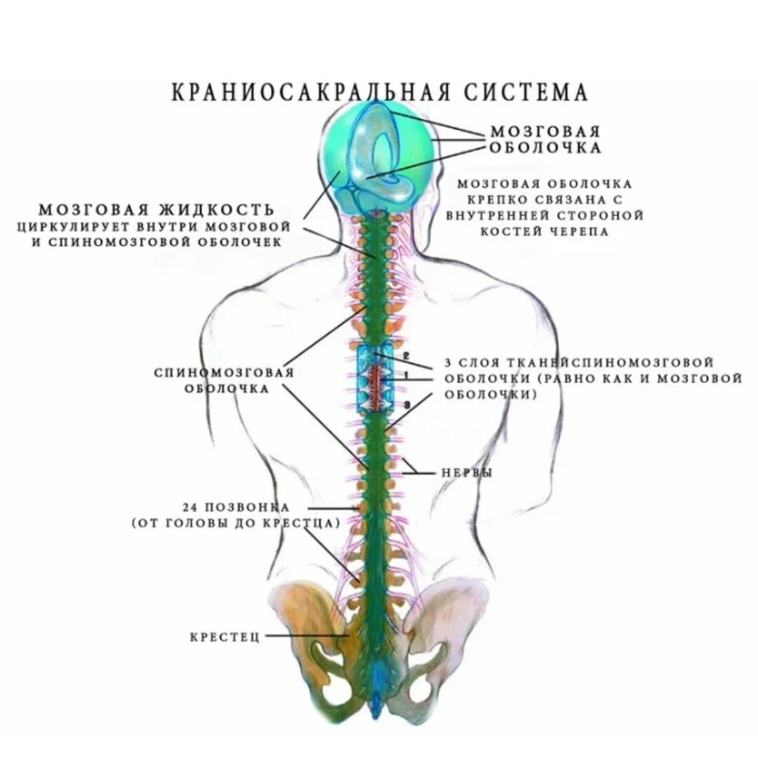 Кроме того, внутри черепа и вдоль всего позвоночного столба находится твердая мозговая оболочка (ТМО), являющаяся единой структурой, связывающей затылочную кость черепа с крестцом, движение которых синхронизируется с помощью микродвижений - краниосакрального ритма.