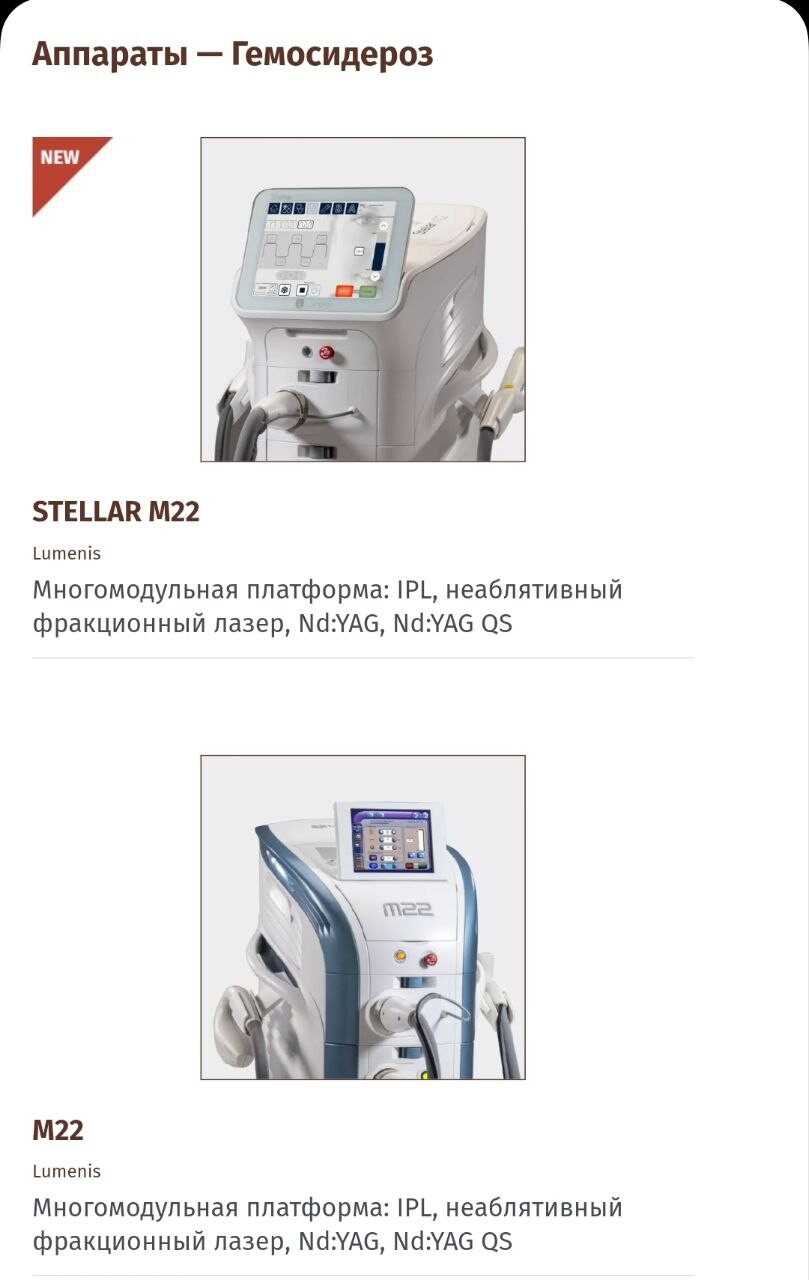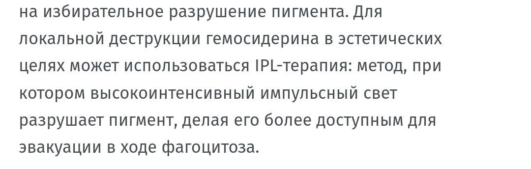 Меня не спрашивайте, я в этом не разбираюсь, но гугл выдает следующее: IPL терапия, насадка М 22. Или просто обращаться к врачу с пояснением, что у вас "посттравматическая пигментация, вызванная гемосидерином" - знающие врачи в курсе, какие аппараты для этого используются.