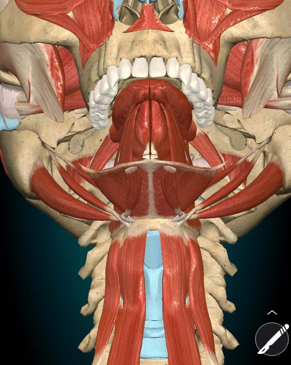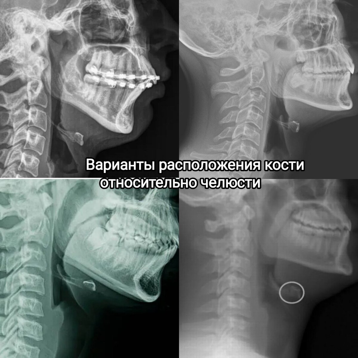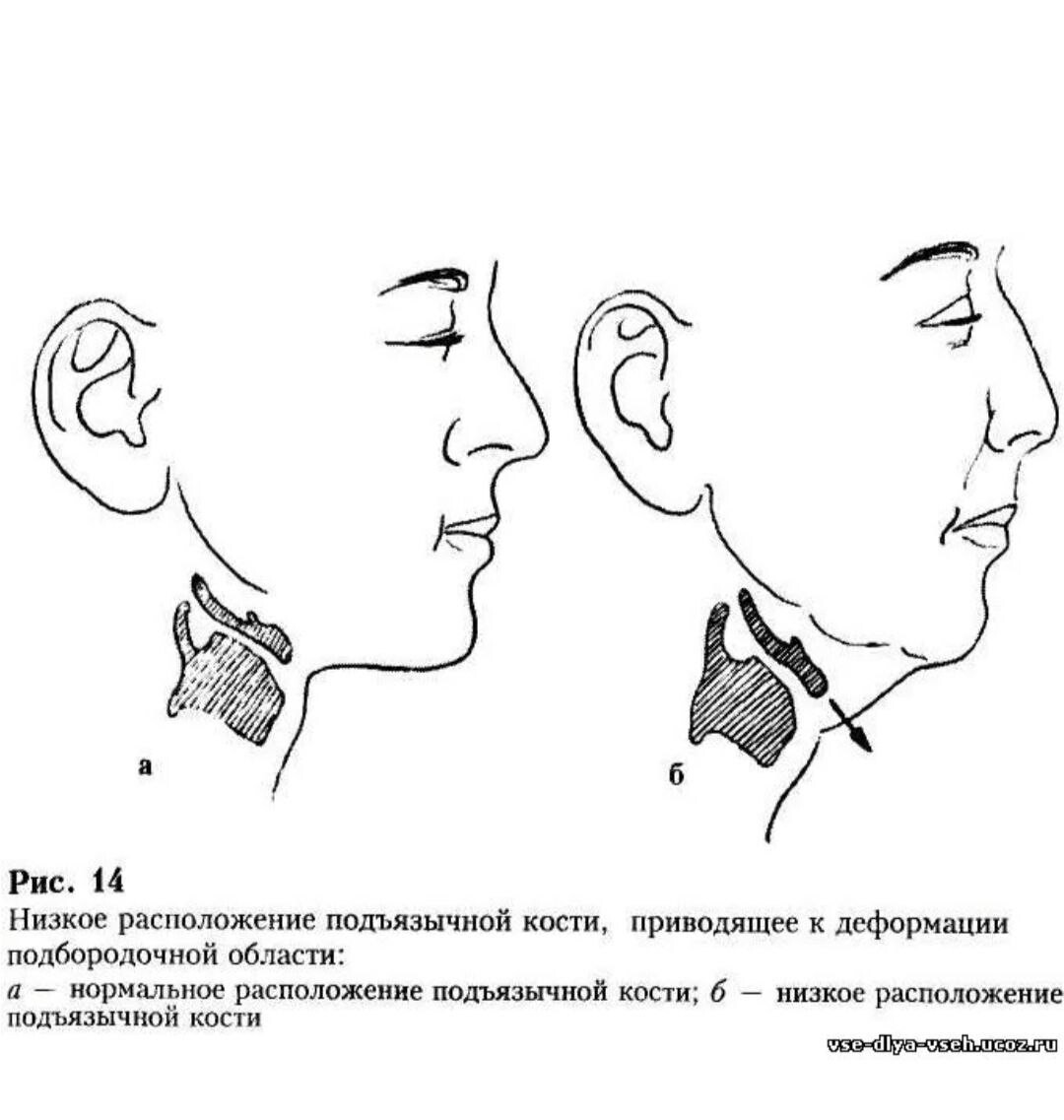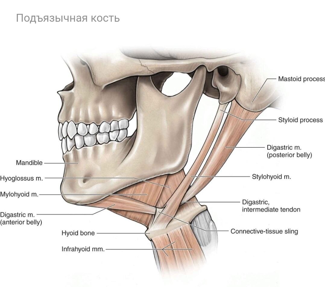 Соответственно, подъязычная кость не сама по себе висит в вакууме и внезапно уехала вниз/вглубь/набекрень, ее положение определяется общим тонусом сопричастной мускулатуры в целом и положением нижней челюсти в пространстве в частности.