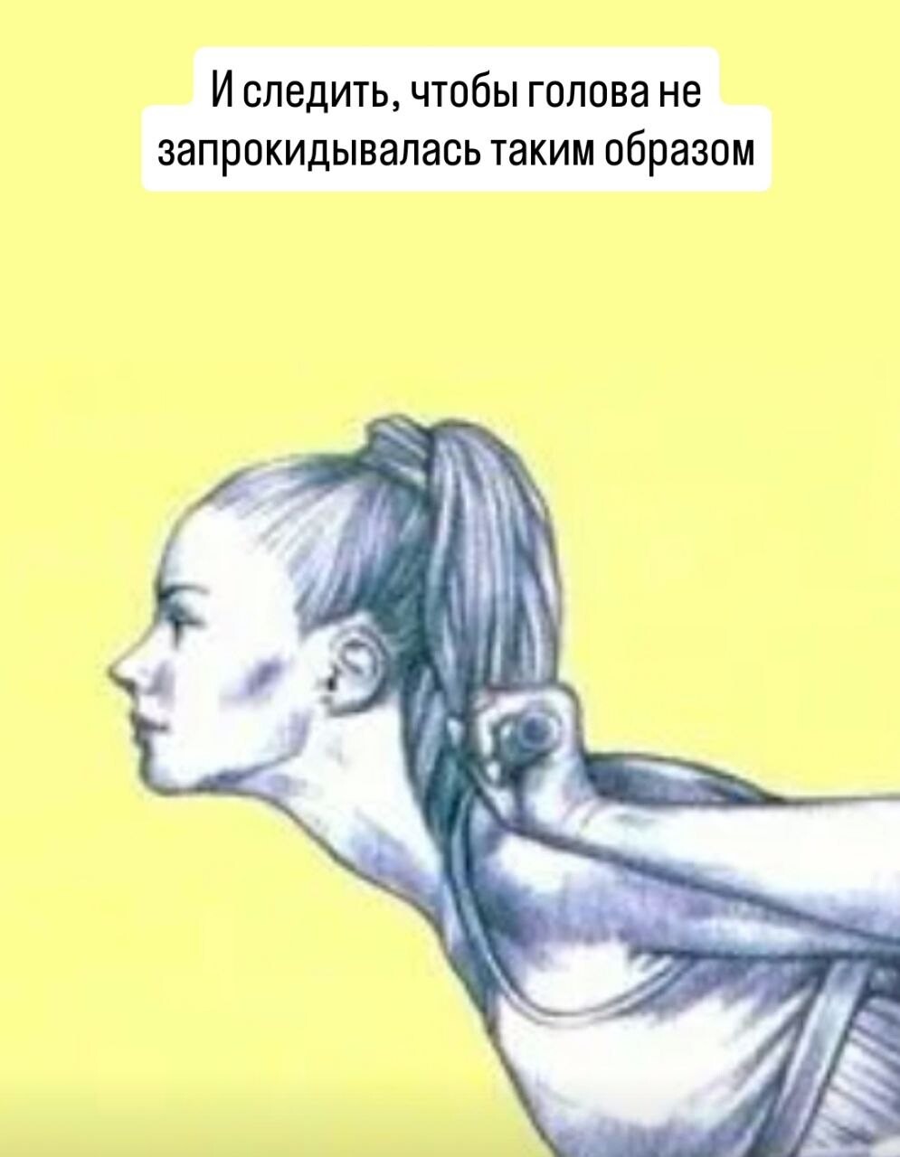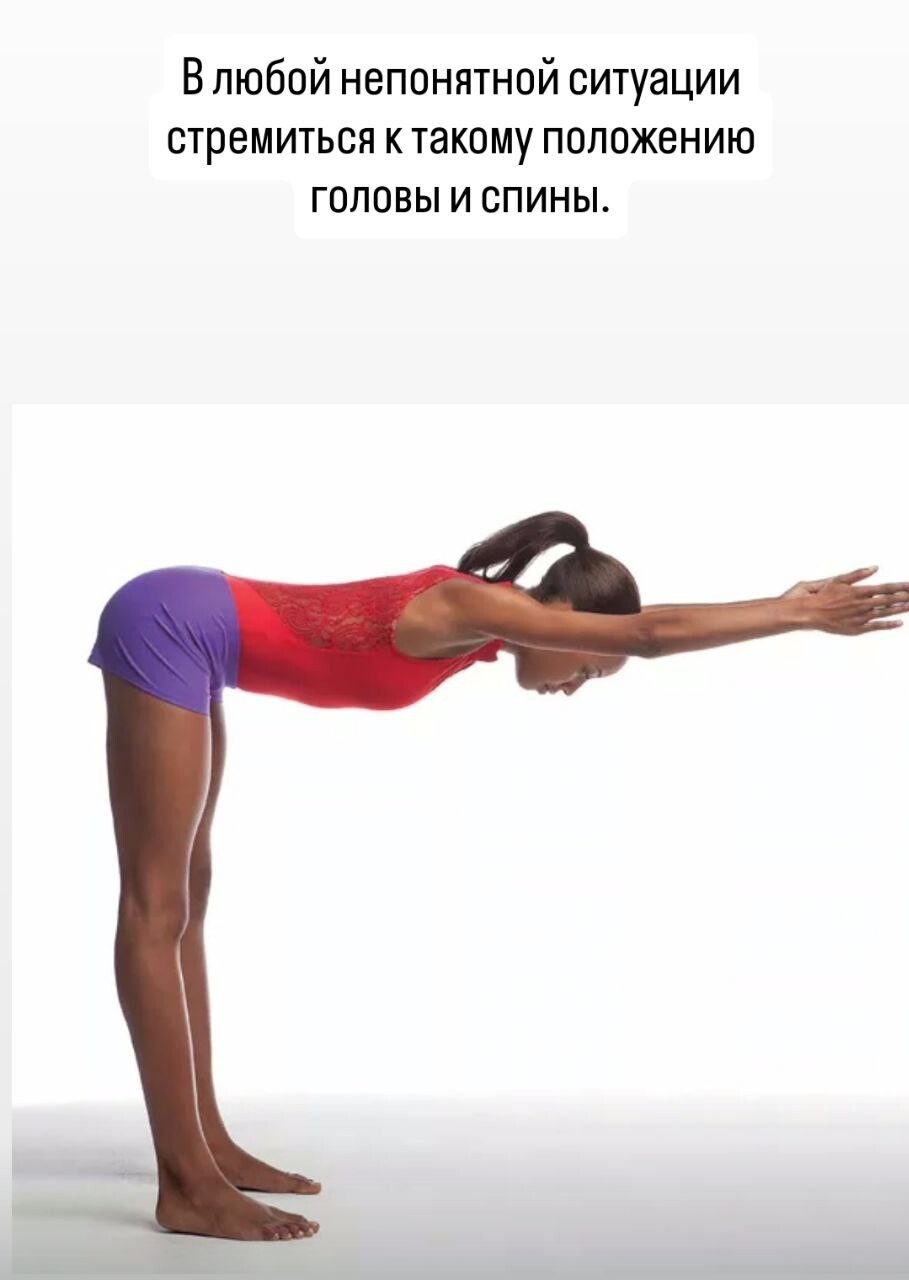 Это можно отлично контролировать, кто занимается пилатесом - знаете, о чем речь, вот так и ходим, макушкой и затылком всегда вверх, в наклонах - вперед. Затылком, не подбородком👌.