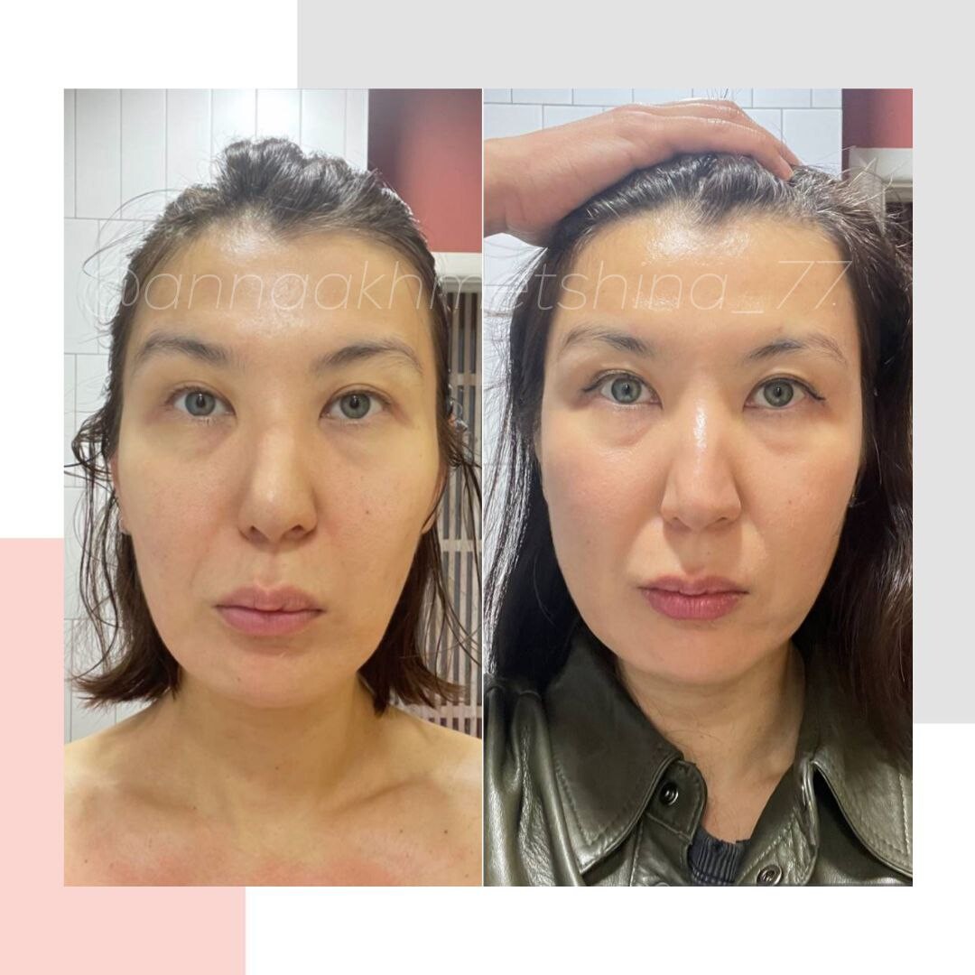 Тут хорошо видно, насколько верхняя челюсть выдвинулась вперед и вверх, появился объем, нижняя челюсть, соответственно, тоже выглядит совершенно иначе, лоб и виски стали шире относительно средней трети, таким образом, пропорции лица очень гармонизировались, лицо стало короче и значительно объемнее.