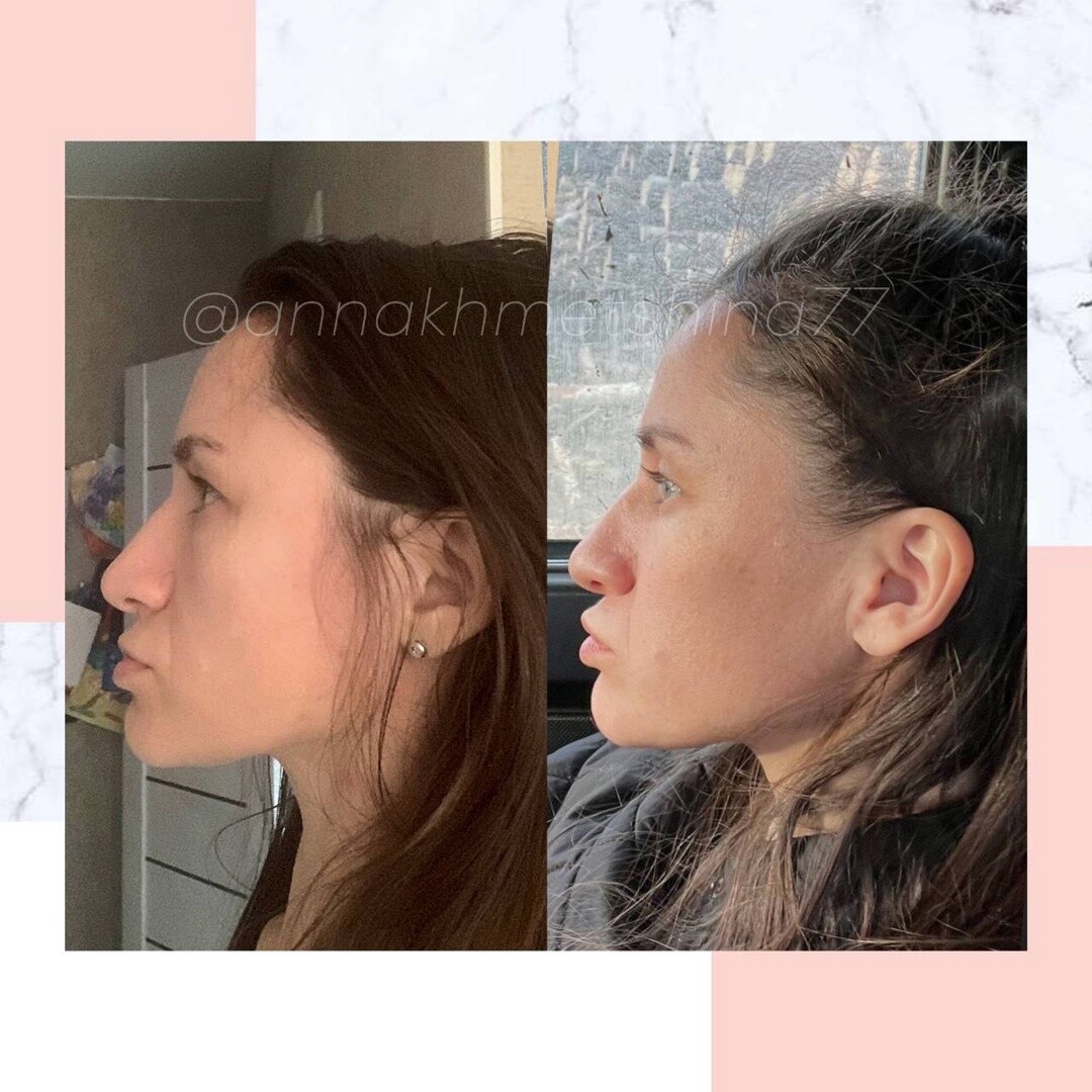 У Оли раньше нижняя челюсть заметно опережала верхнюю, но теперь совершенно другие лицевые параметры, распушилась верхняя губа, нос выглядит изящнее на фоне объема верхней челюсти.