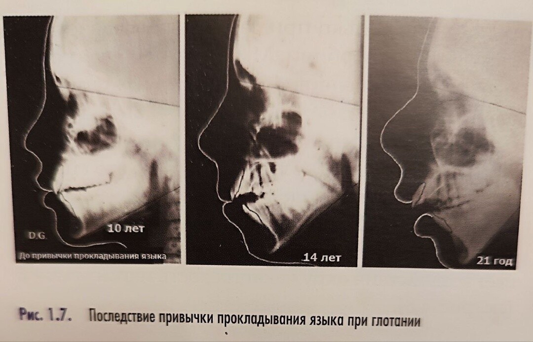 «Trotman и соавт. (1997) продемонстрировали графически зависимость роста лицевого скелета от положения открытого рта, показав, что лицевой скелет ремоделируется, внизи кзади при положении открытого рта.