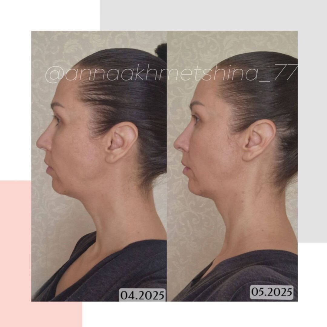 Лицо расправилось, стало шире в средней и верхней третях, глаза и брови пошли в разлет, подбородок расслабился, улучшилась симметрия (см на уши, глаза, брови), шея длиннее.