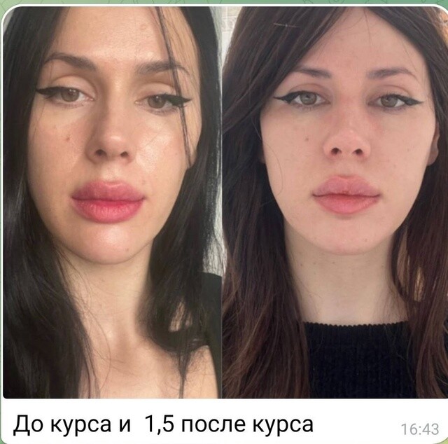 Теперь все изменилось, лицо снова обрело молодые гладкие черты, ушла рубленность, вернулись щечки, наполнилось под глазами, форма глаз вытянулась к вискам (за счет расширения верхней и средней трети), а также ушла десневая улыбка (на фото Инесс улыбается совсем слегка, но видно, что губа "до" поднимается выше, причём сама форма губы тоже улучшилась, завернулась.