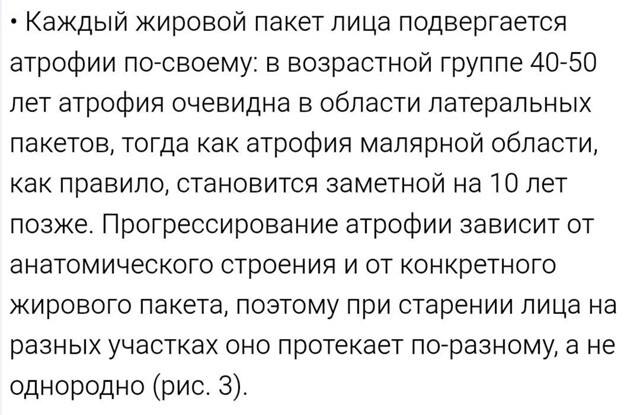 Выдержка из анатомического обзора для пластических хирургов относительно возраста истиной атрофии жировых пакетов.