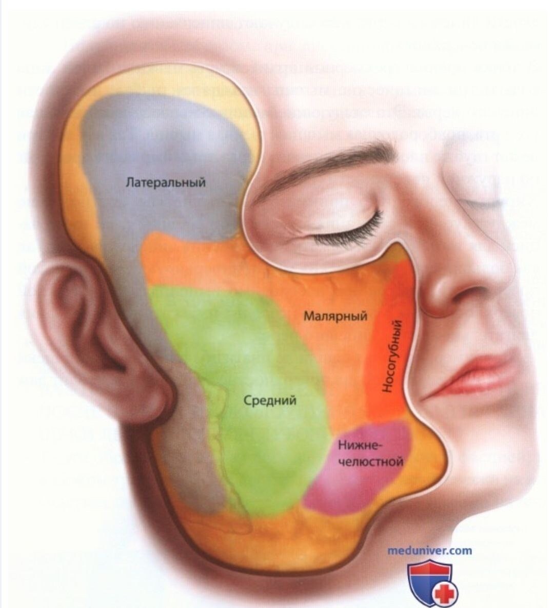 Перевожу на русский: в среднем по больнице первой убывает кодкожка в зеленой и голубой зонах, а область под глазами (оранжевый и красный) худеет (именно атрофия жировых пакетов) в возрасте 50-60 лет (лишний вес в лицо и отеки - другая история).