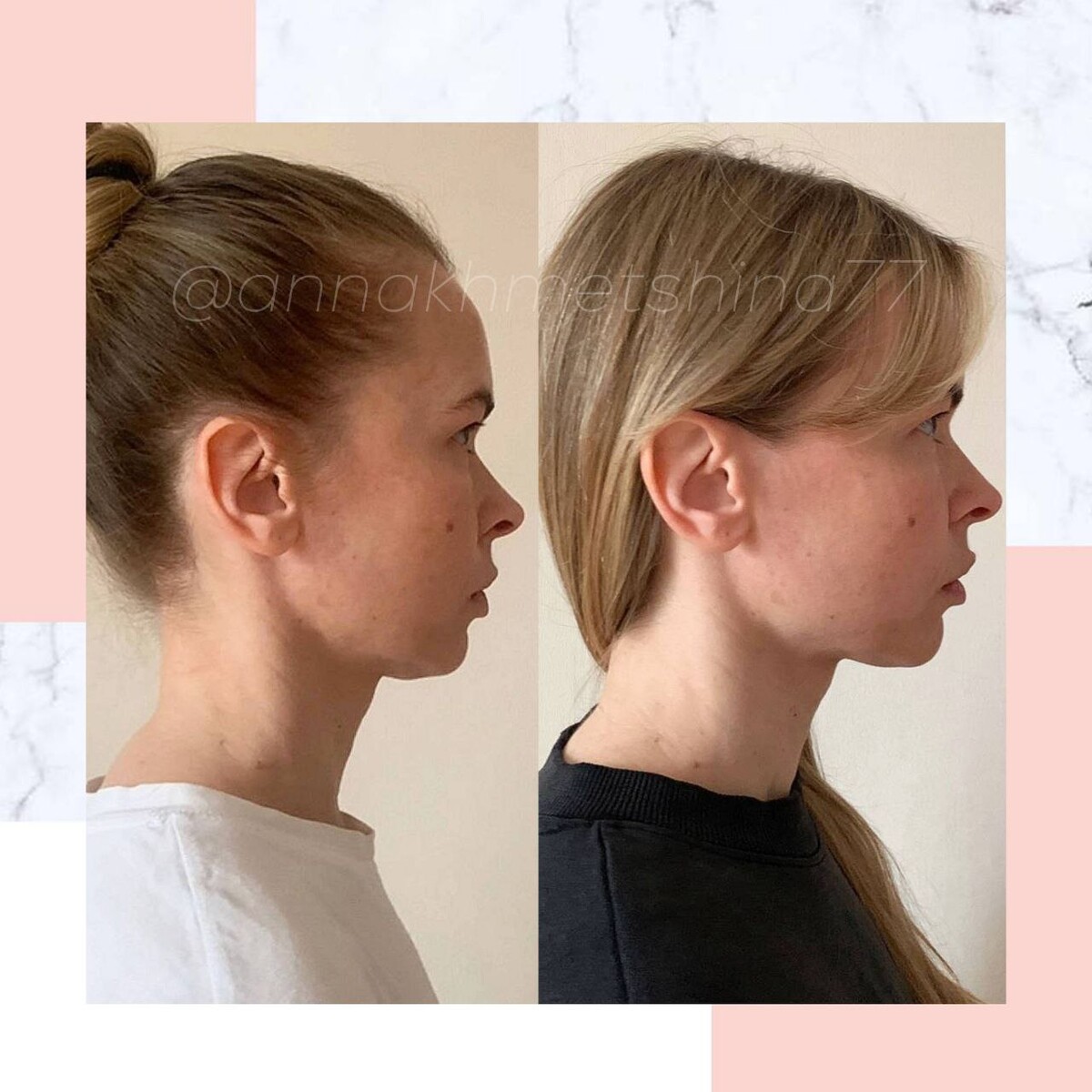 В профиль заметно, что максилла вышла вперёд, челюсти стоят горизонтальнее.
