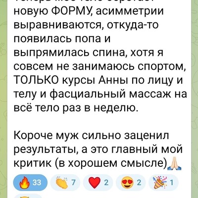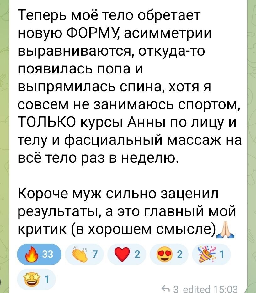 К курсу Краниоформ Алиса добавила Гармонию тела и очень впечатлена результатами.В личке Алиса рассказала, что помимо того, что иначе заработала стопа, выровнялись таз, позвоночник и перестал вываливаться животик, - очень изменилась форма ягодиц (видно по складочкам), а также встала на место грудь после трех кормлений.
