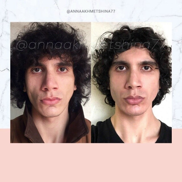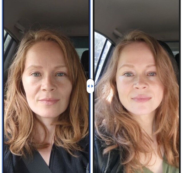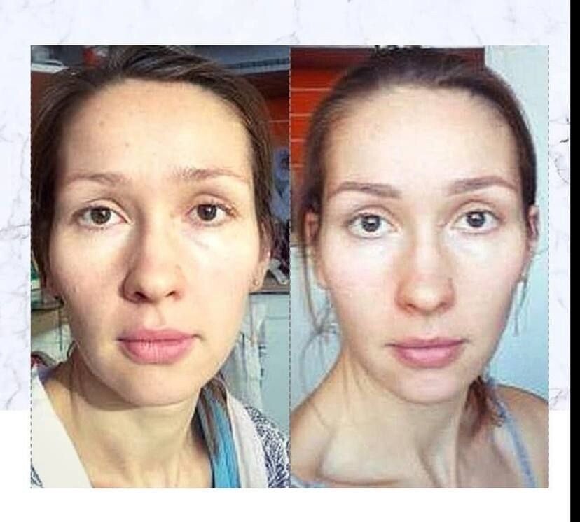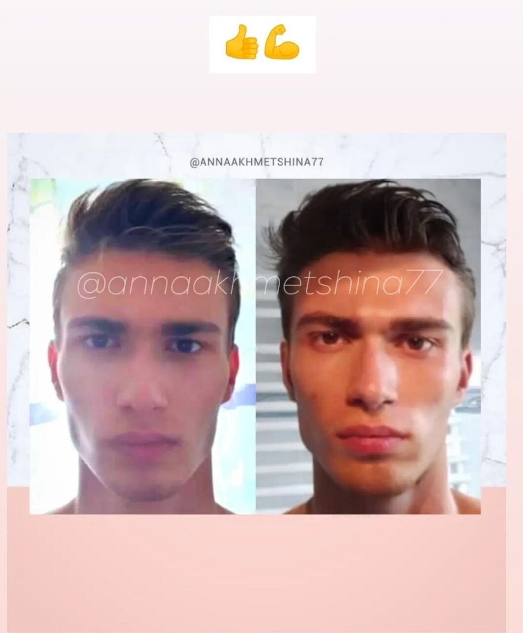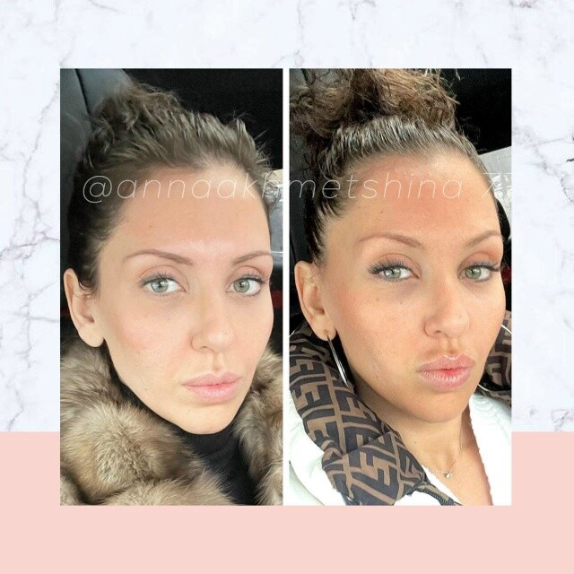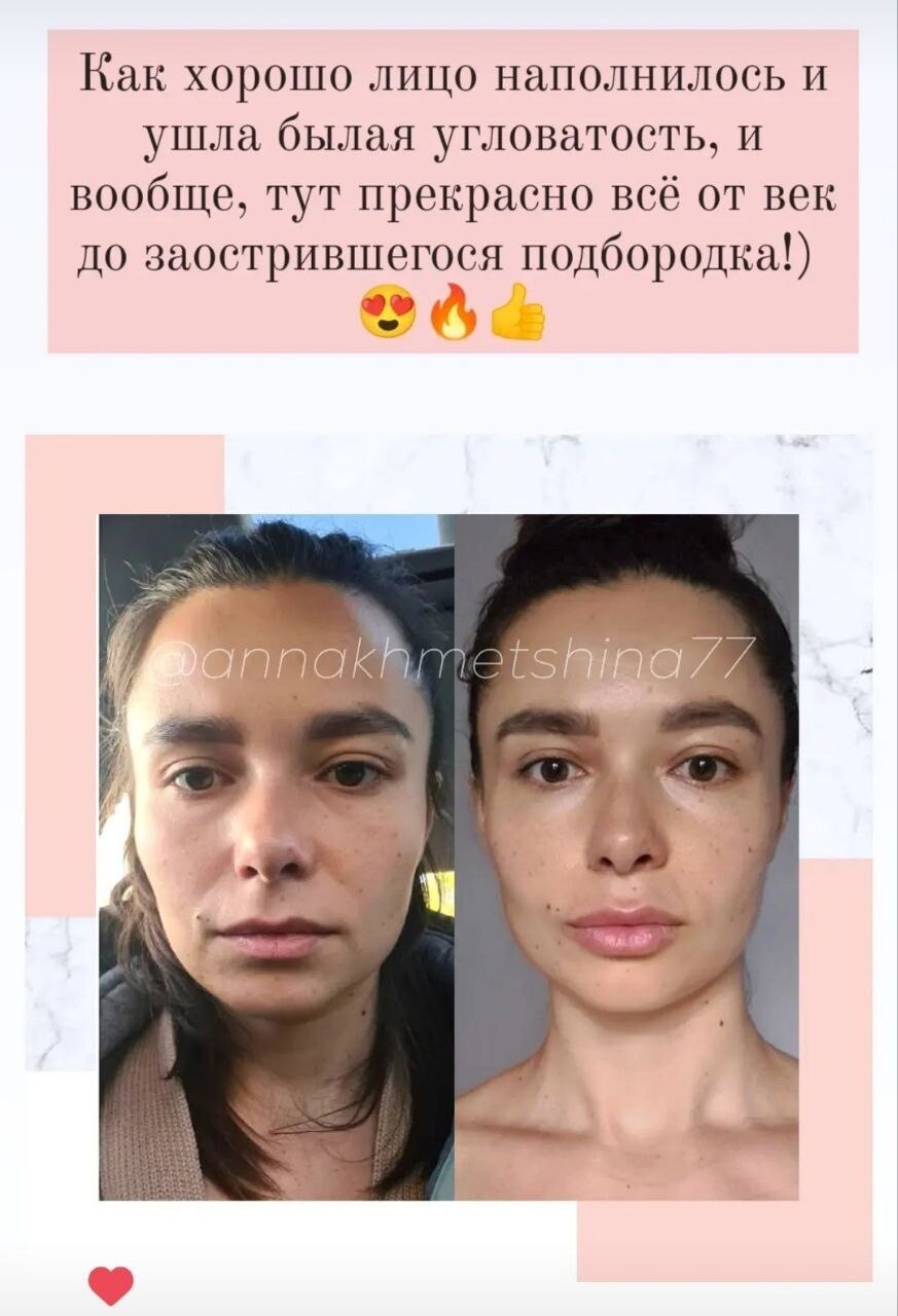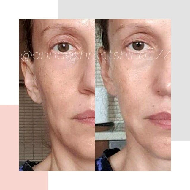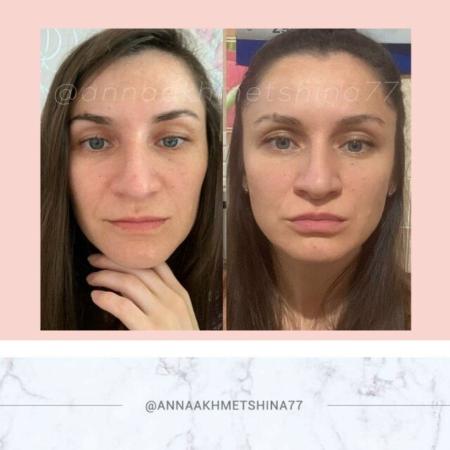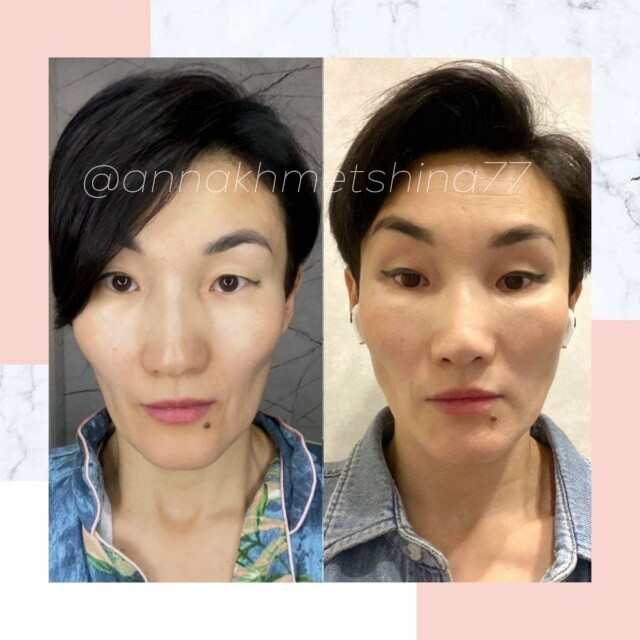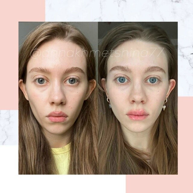 За счет изменения наклонов костей (слева есть рубленность овала, хотя щеки в нижней трети выглядят пышнее) перераспределились объемы, щека поднялась на место и стала гладкой, а овал - сердечком.