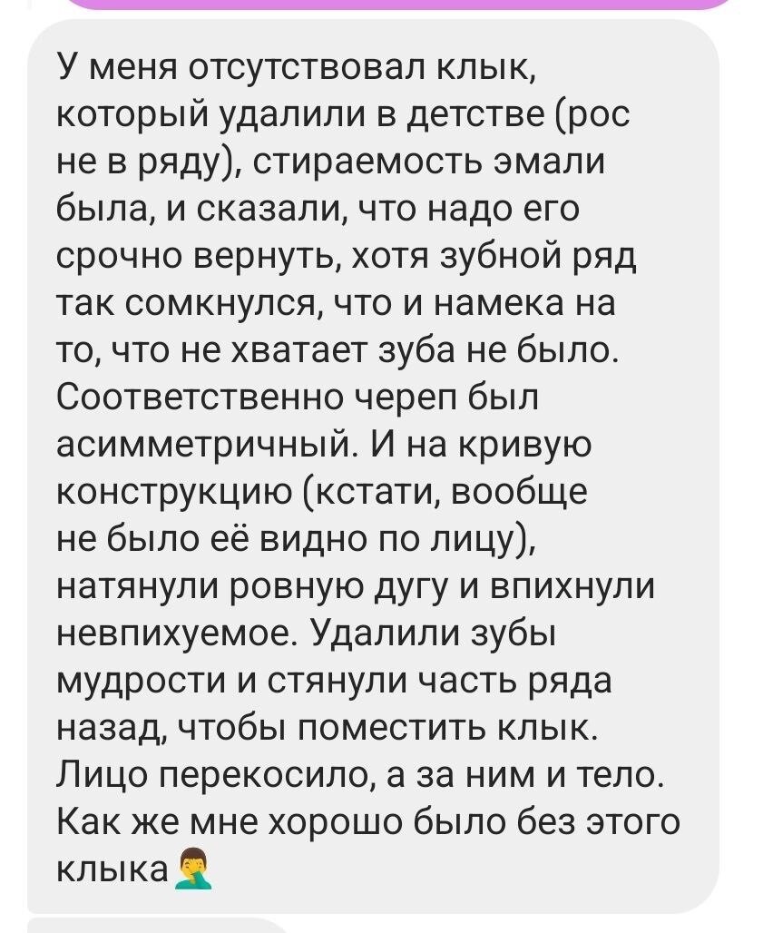 Ну короче, миллион раз писала и пишу: ортодонт всегда найдет, зачем вам необходимо ставить брекеты, работа у него такая, но человек должен четко понимать свои интересы и показания, а главное, осознавать возможные последствия такого рода вмешательств в организм.