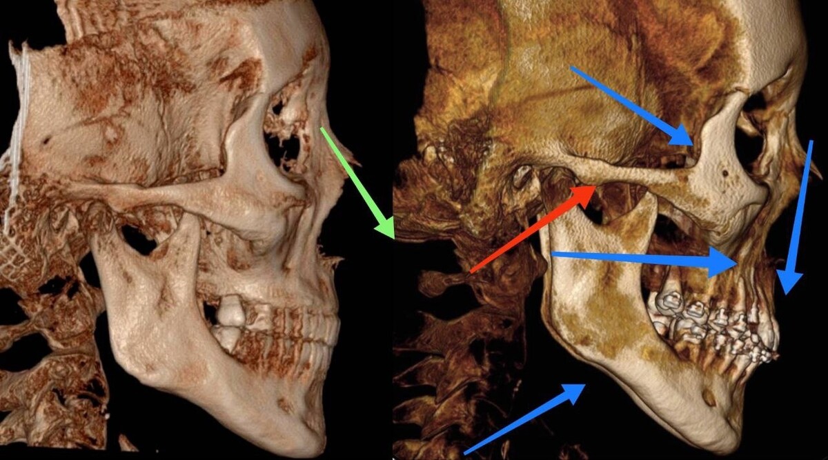 Хорошо видны не только изменения наклонов костей и статики шеи, но и заметна значительная убыль костной ткани (резорбция) по всем костям (нижняя челюсть, скуловая, скуловой отросток височной, премаксилла),и смотрим на длину и объем максиллы от носовой кости до резцов вч.