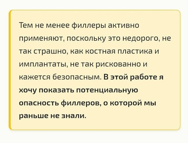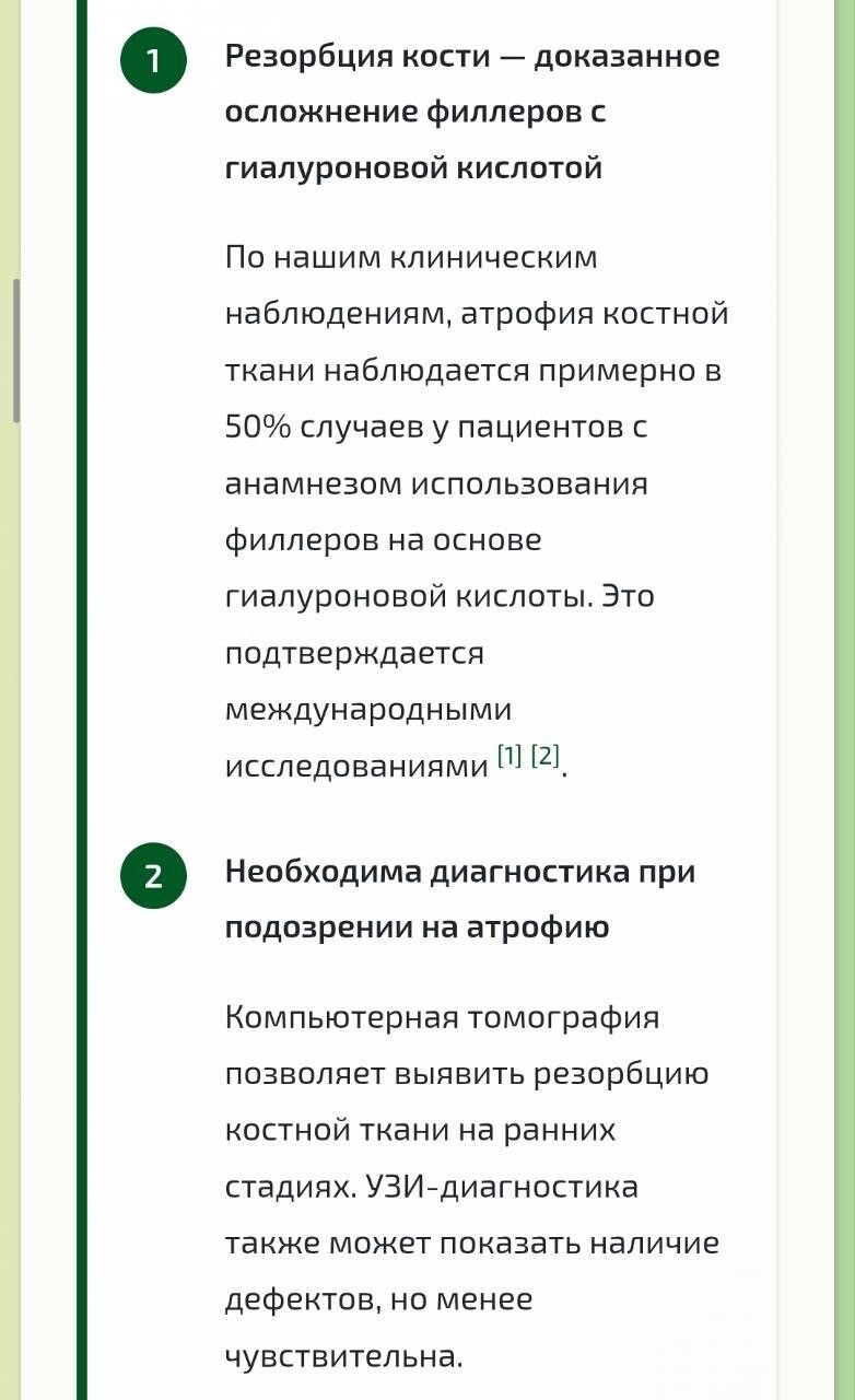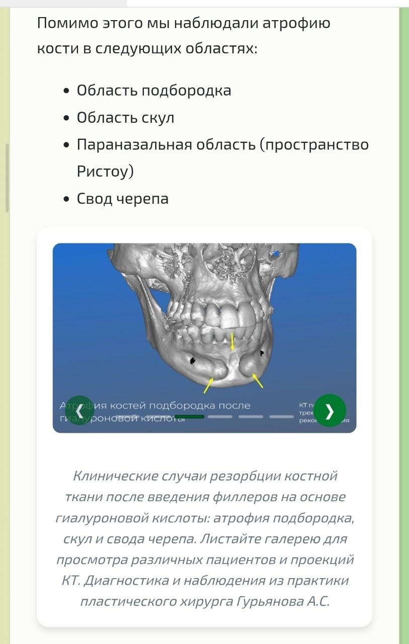 с 40-летним стажем А. С. Гурьянова: исследования доказали, что филлеры приводят к резорбции костной ткани и, соответственно, потере объемов именно там, где и планировалось их добавить. Рекомендую прочитать статью целиком.