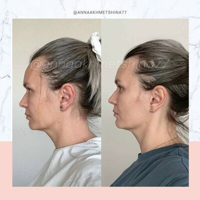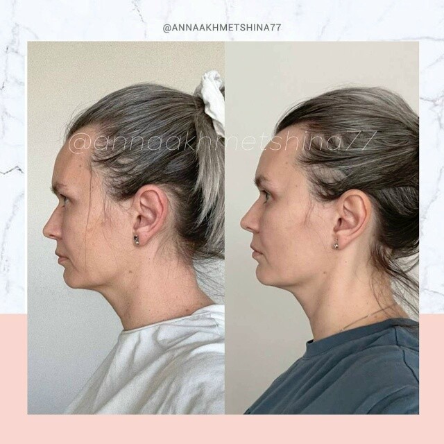 В профиль изменилась статика шеи, но даже если лицо выровнять по наклону носа, видно, как вышли глаза, выдвинулась вперед и вверх зона под глазами, меньше контурируется лобная кость (виски наполнились), уменьшилась складочка возле рта👌