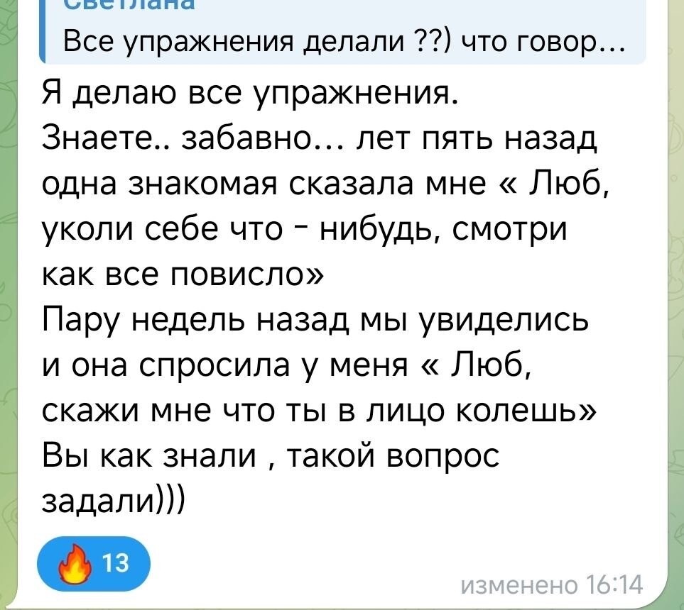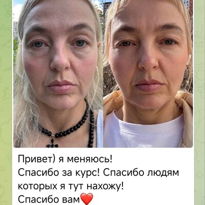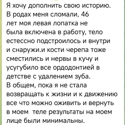 Меж тем мы видим, что ушли мешки под глазами, верхние веки подраспушилось, расправился лоб, лицо стало более гладким, подтянутым, шире и наполненнее. 💞