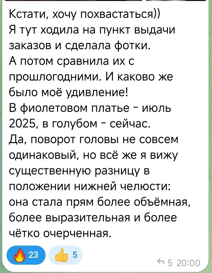 Лицо собралось, подтянулся овал, глаза действительно (в предыдущем посте это хорошо видно) стали более красивой, миндалевидной формы, удлиннилась шея)😍👍